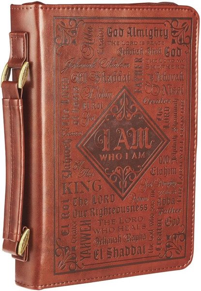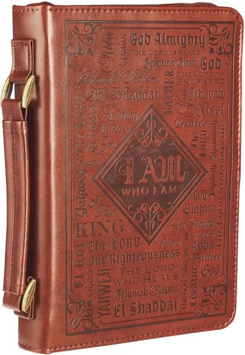- Scripture Bible Case: This handsome brown case features the many names of God debossed on the front panel, and scripture sentiment from Exodus 34:6 with an elegant border design.